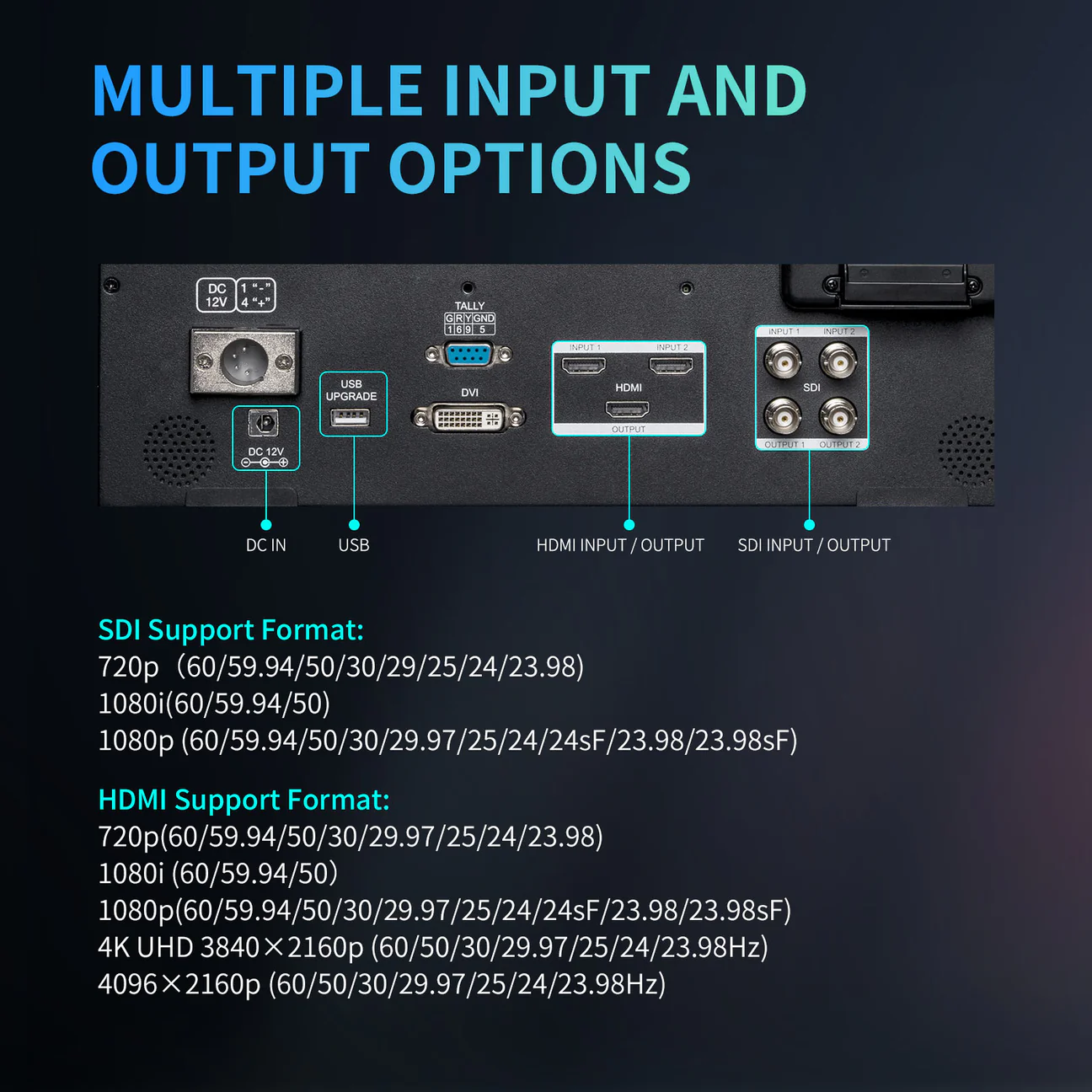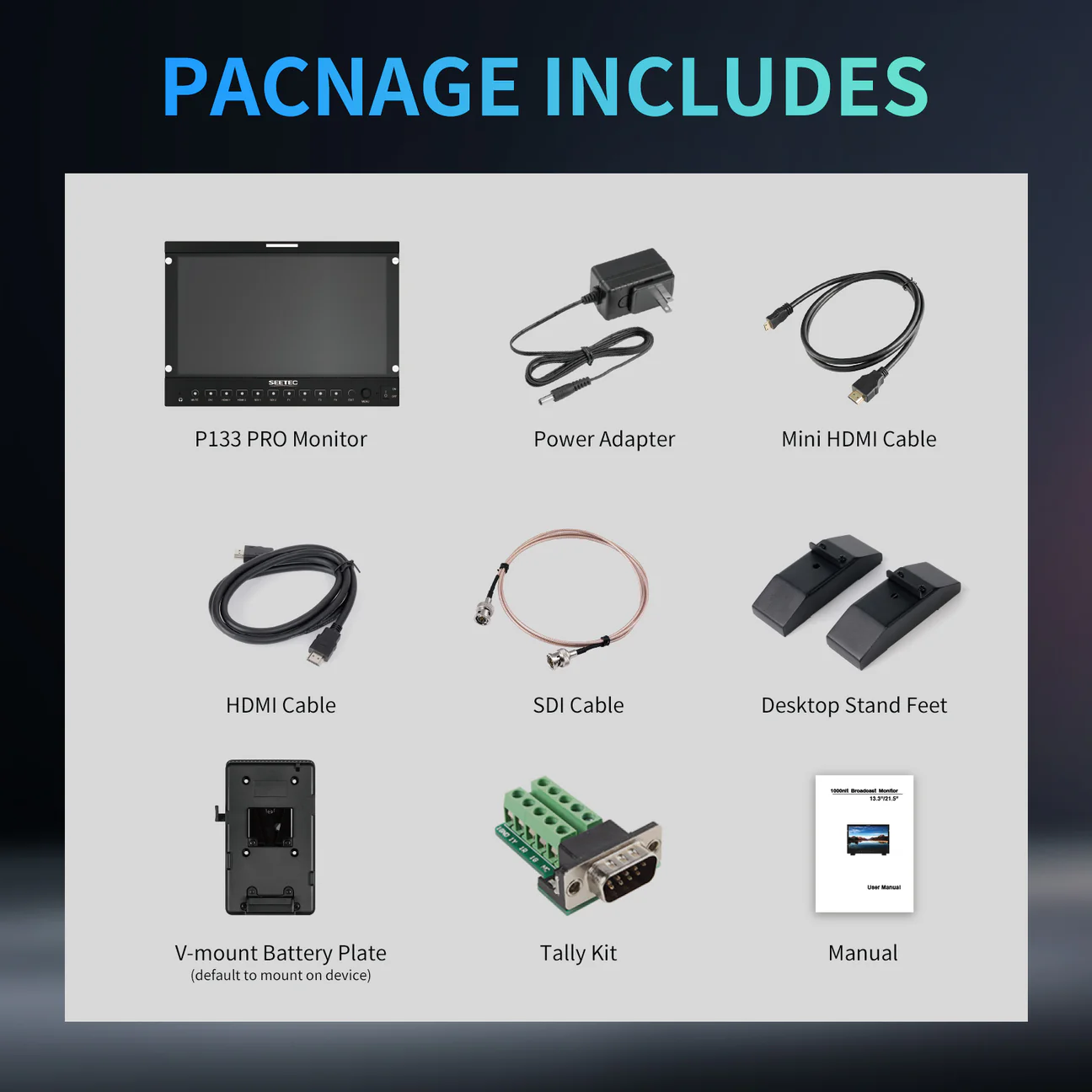 P133 PRO is a high quality monitor that is versatile enough to be used for broadcast studio, live production or crew outdoor shooting. P133 PRO works with all SD/HD/3D-SDI and up to 4K HDMI@60Hz video formats and including XLR,DC IN power input and V-mount battery plate so you can use it with battery or plug it into DC power. A series of camera auxiliary functions can help photographer to compose on-site and save post production time. This monitor can be mounted on wall through a VESA stand in addition to a desktop stand.