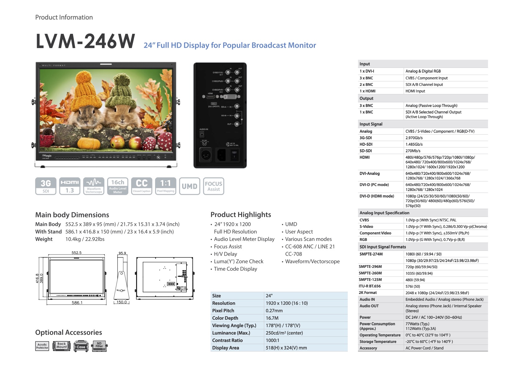 LVM-246W is a reasonable priced broadcast monitor with new full HD and wide viewing angle IPS LCD. It supports various video interface of SD/HD/3G-SDI, HDMI, DVI, Component Video, S-Video and CVBS. Also provides professional features such as Waveform & Vectorscope, Markers, Timecode, Closed Caption and color calibration.