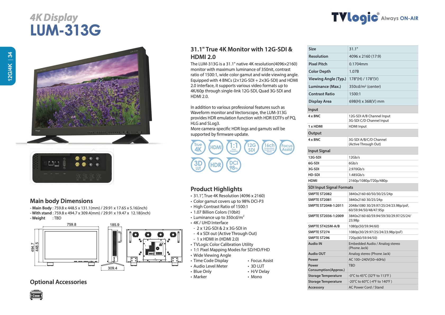 - Various 4K/UHD Input & Output Options: LUM-series monitors support various types of 4K/UHD video inputs.