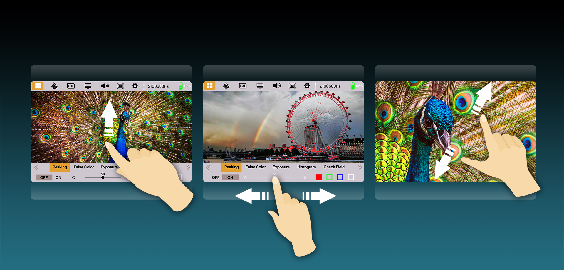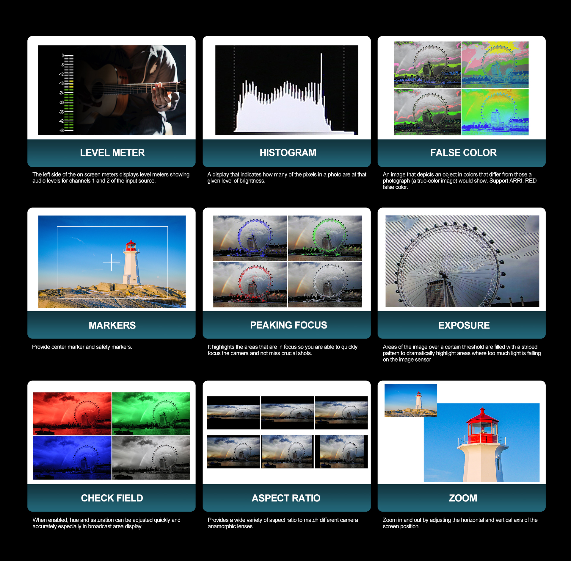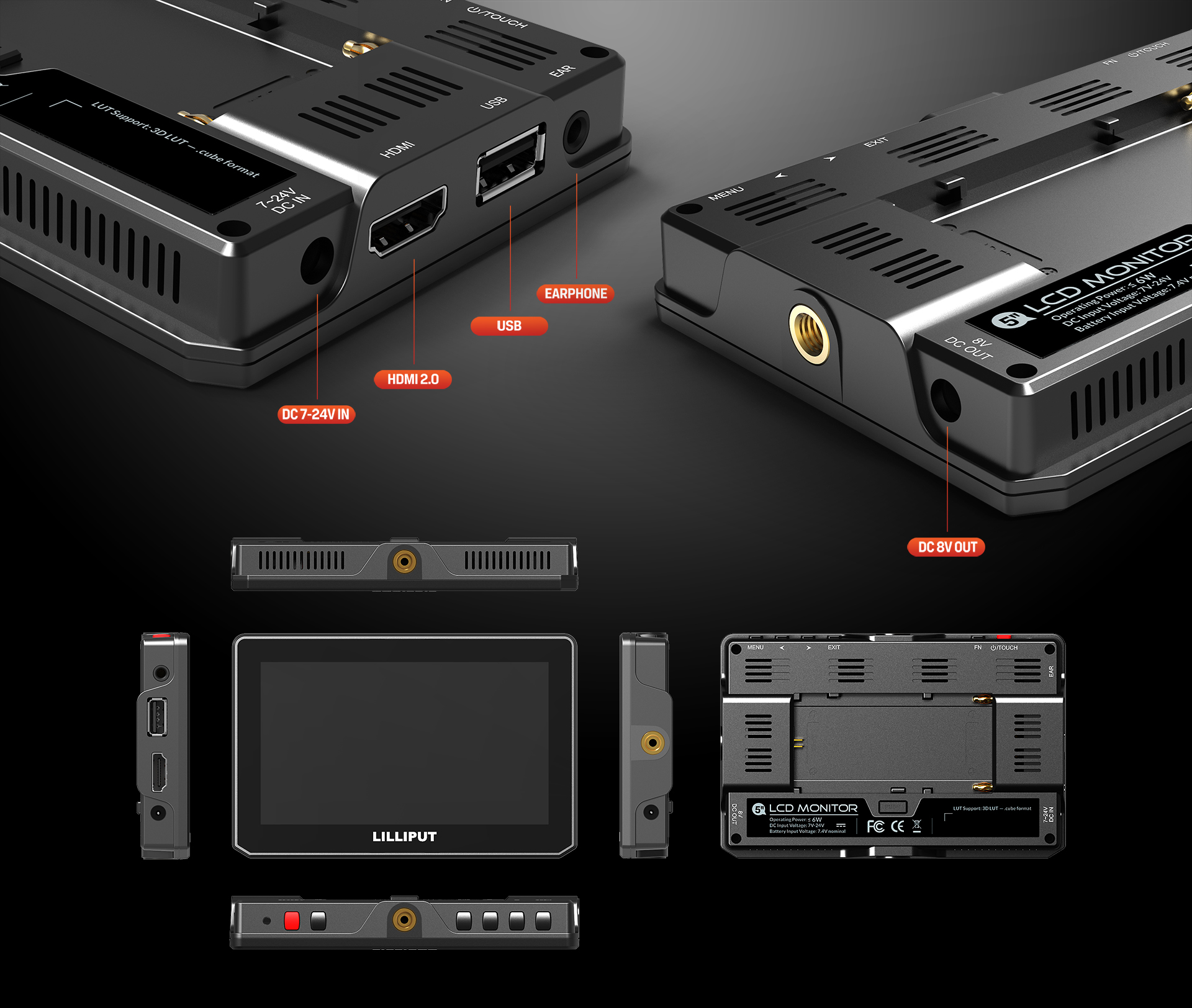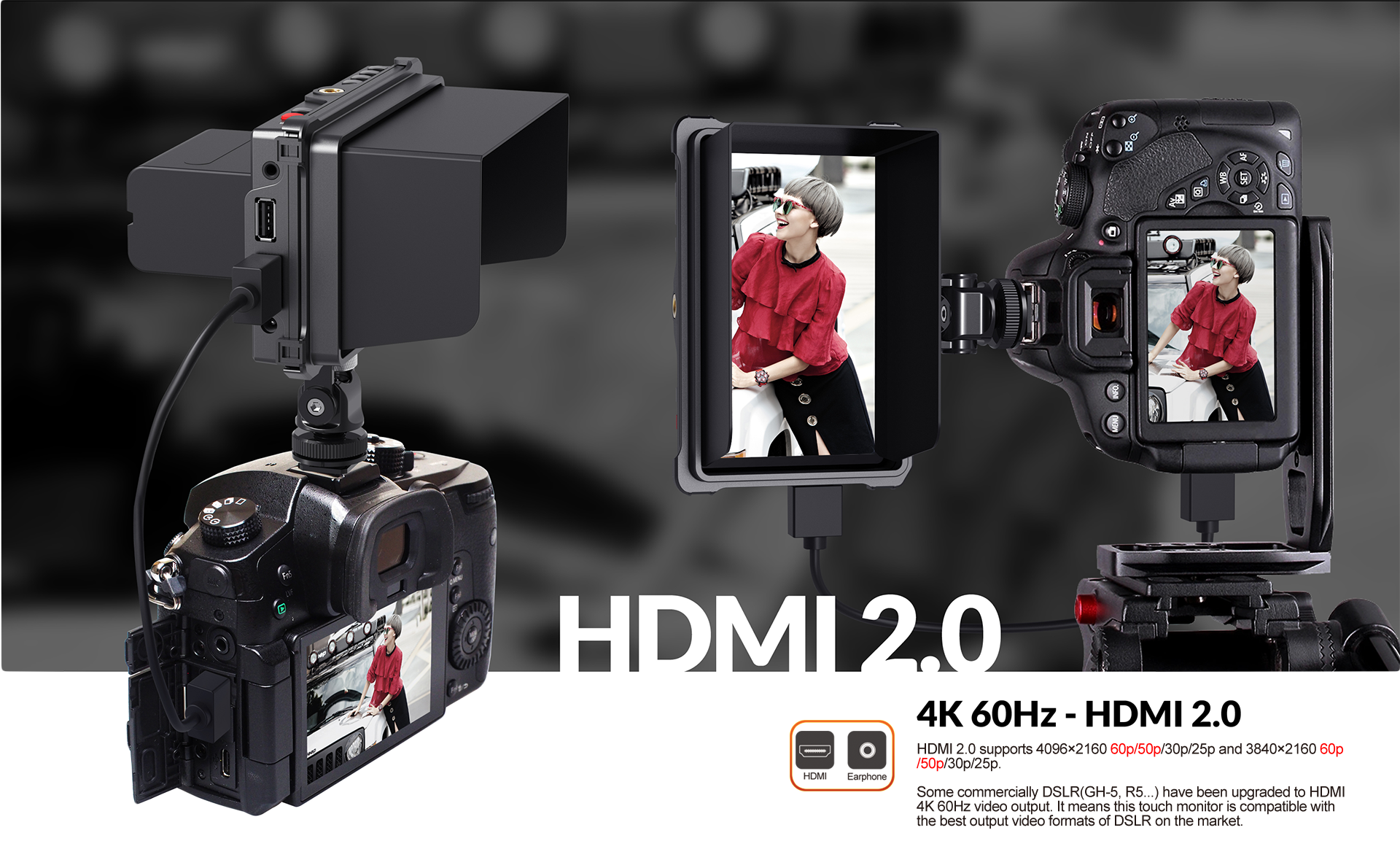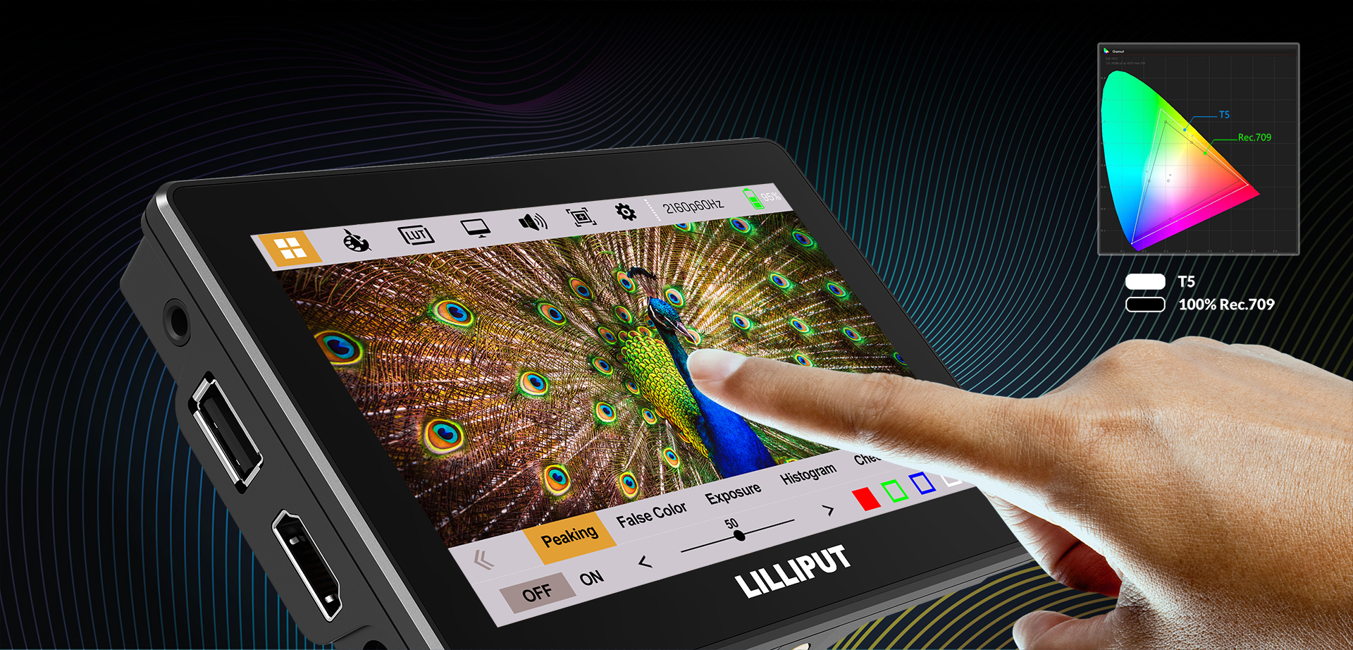 T5 is a portable camera-top monitor specifically for micro-film production and DSLR camera fans, which features 5″ 1920×1080 FullHD native resolution screen with fine picture quality and good colour reduction.The HDMI 2.0 supports 4096×2160 60p/50p/30p/25p and 3840×2160 60p /50p/30p/25p signal input. For the advanced camera auxiliary functions, such as peaking filter, false colour and others, all are under professional equipment testing and correction, parameters accurate. So the touch monitor is compatible with the best output video formats of DSLR on the market.
