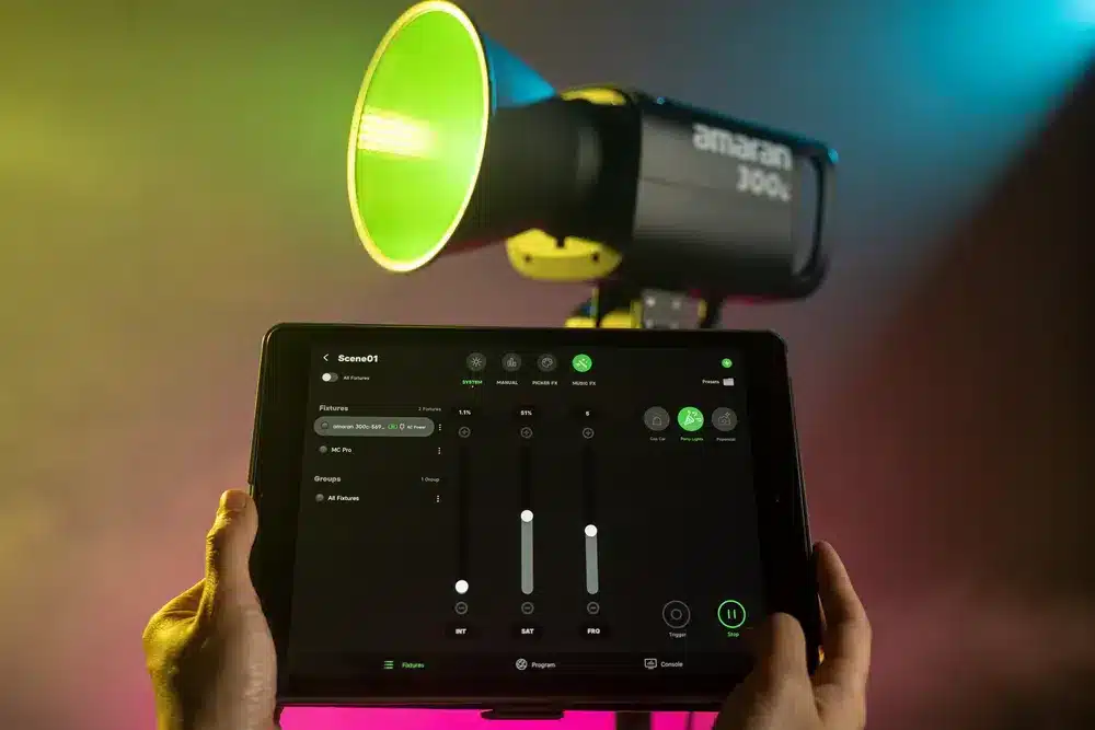 Using Sidus Mesh technology, the amaran 300c can be controlled wirelessly. The Sidus Link App can help match colors perfectly with Color Picker and activate 9 System FX including Party Lights, Cop Car, Paparazzi, Fireworks, Lightning, Faulty Bulb, TV, Explosion, Fire, Pulsing, and Strobe.