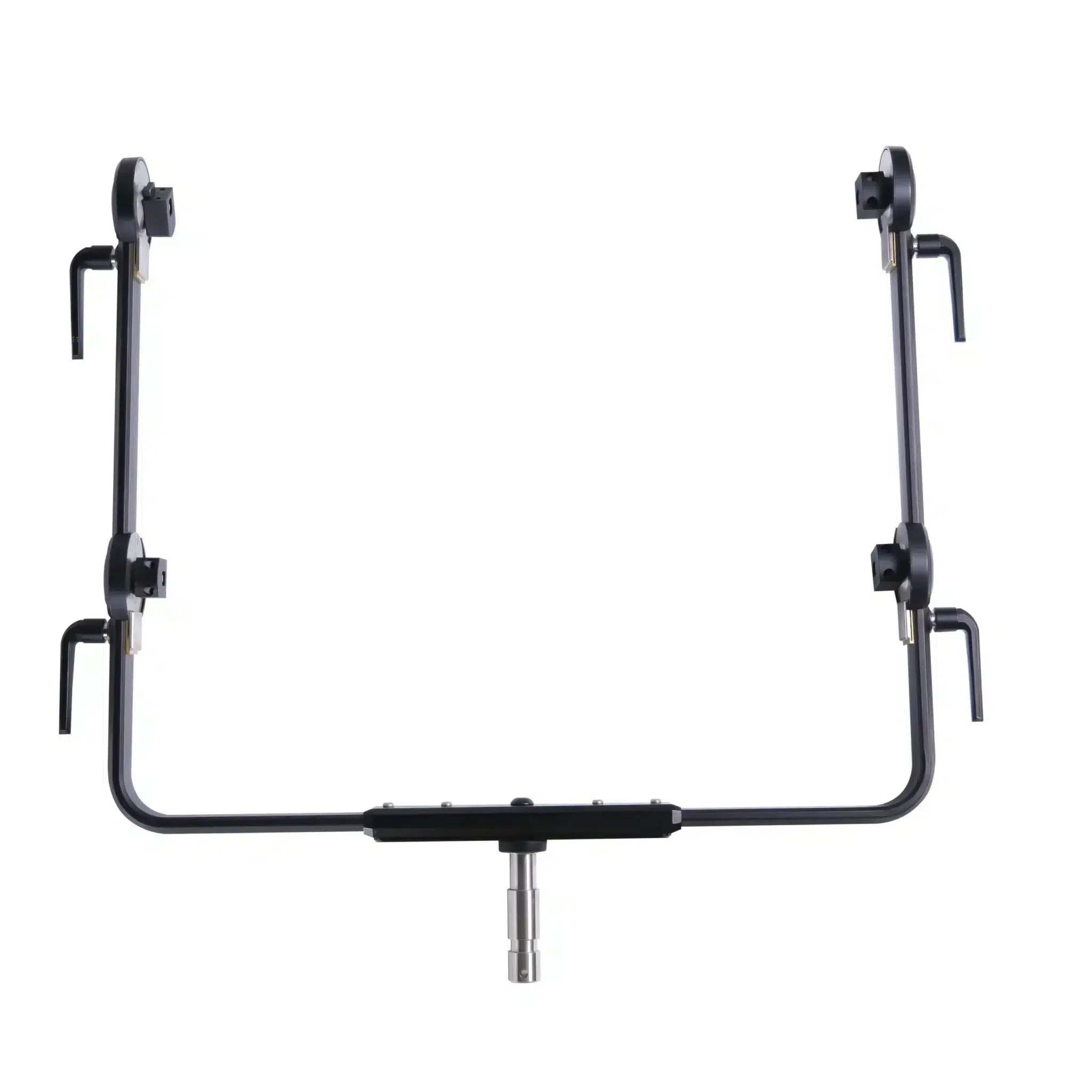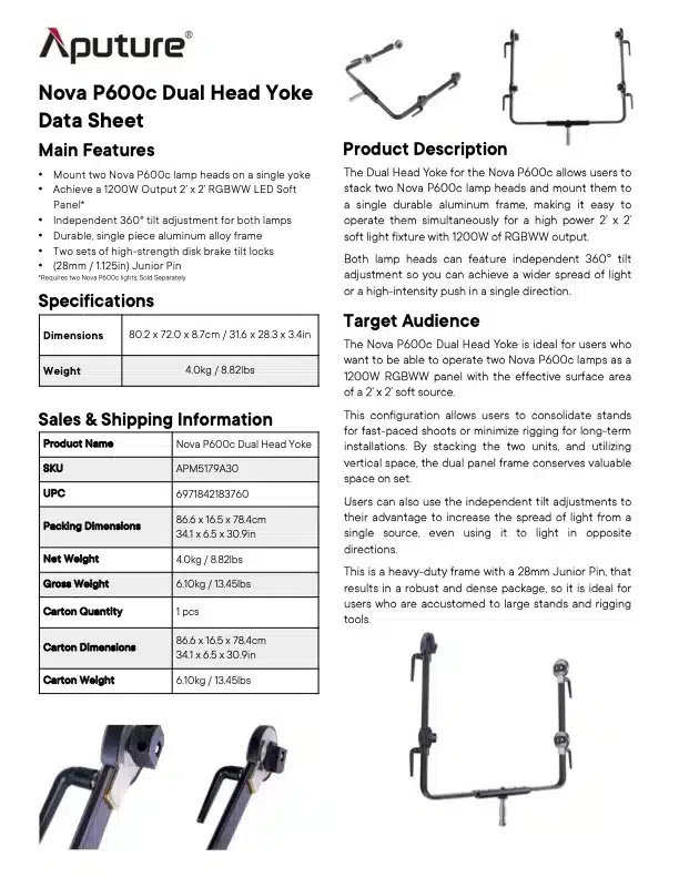 The Dual Head Yoke for the Nova P600c allows users to stack two Nova P600c lamp heads and mount them to a single durable aluminum frame, making it easy to operate them simultaneously for a high power 2’ x 2’ soft light fixture with 1200W of RGBWW output.