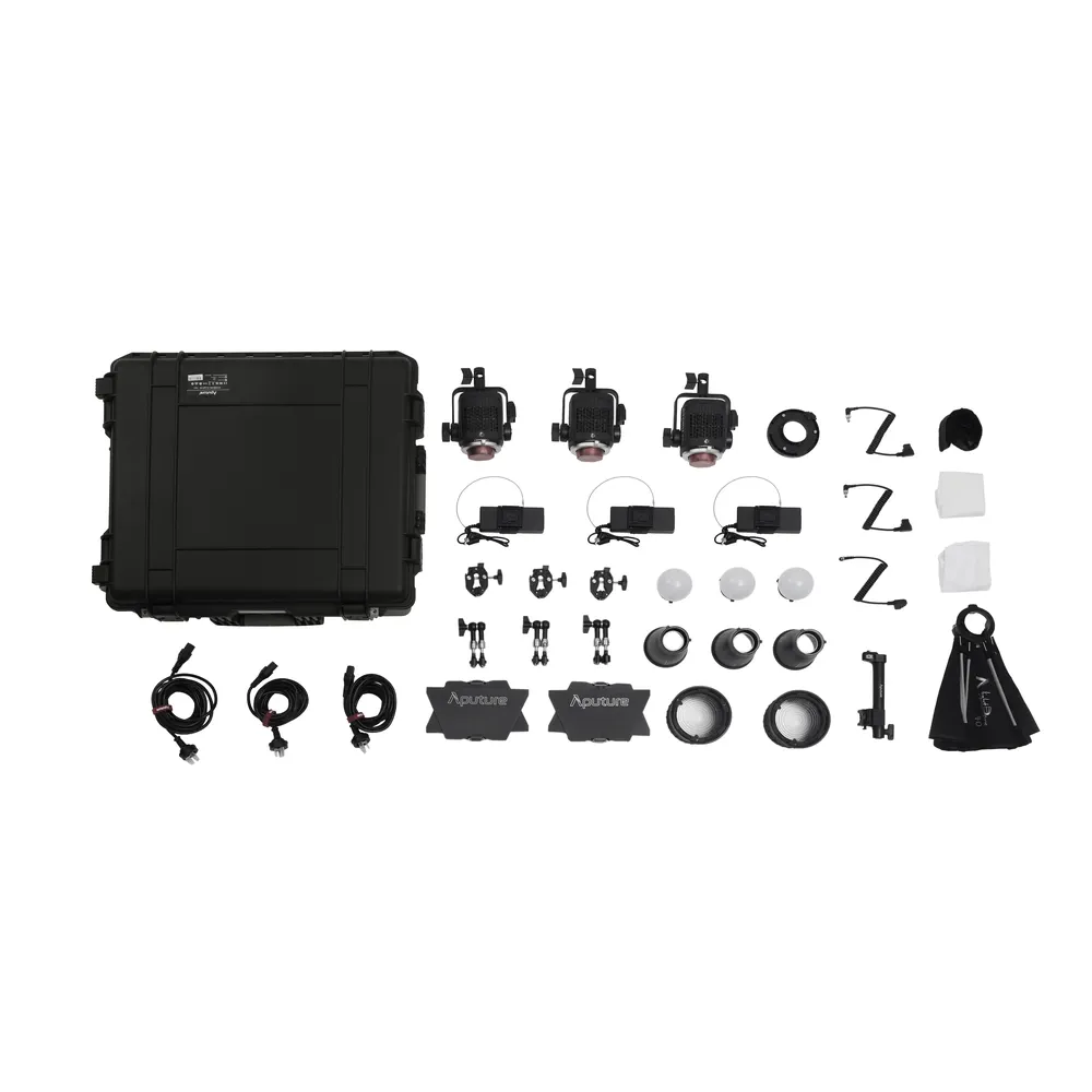 The Aputure STORM 80c 3-Light Kit is an all-in-one professional lighting toolkit—three STORM 80c lamps featuring the BLAIR-CG light engine, Hyper Reflectors, CF4 Fresnels with Barn Doors, Mini Lantern Diffusers, the Light Dome 40 Diffuser, Bowens Adapter, Handheld Bracket, battery cables, and mounting clamps, all in a hard-shell rolling case.