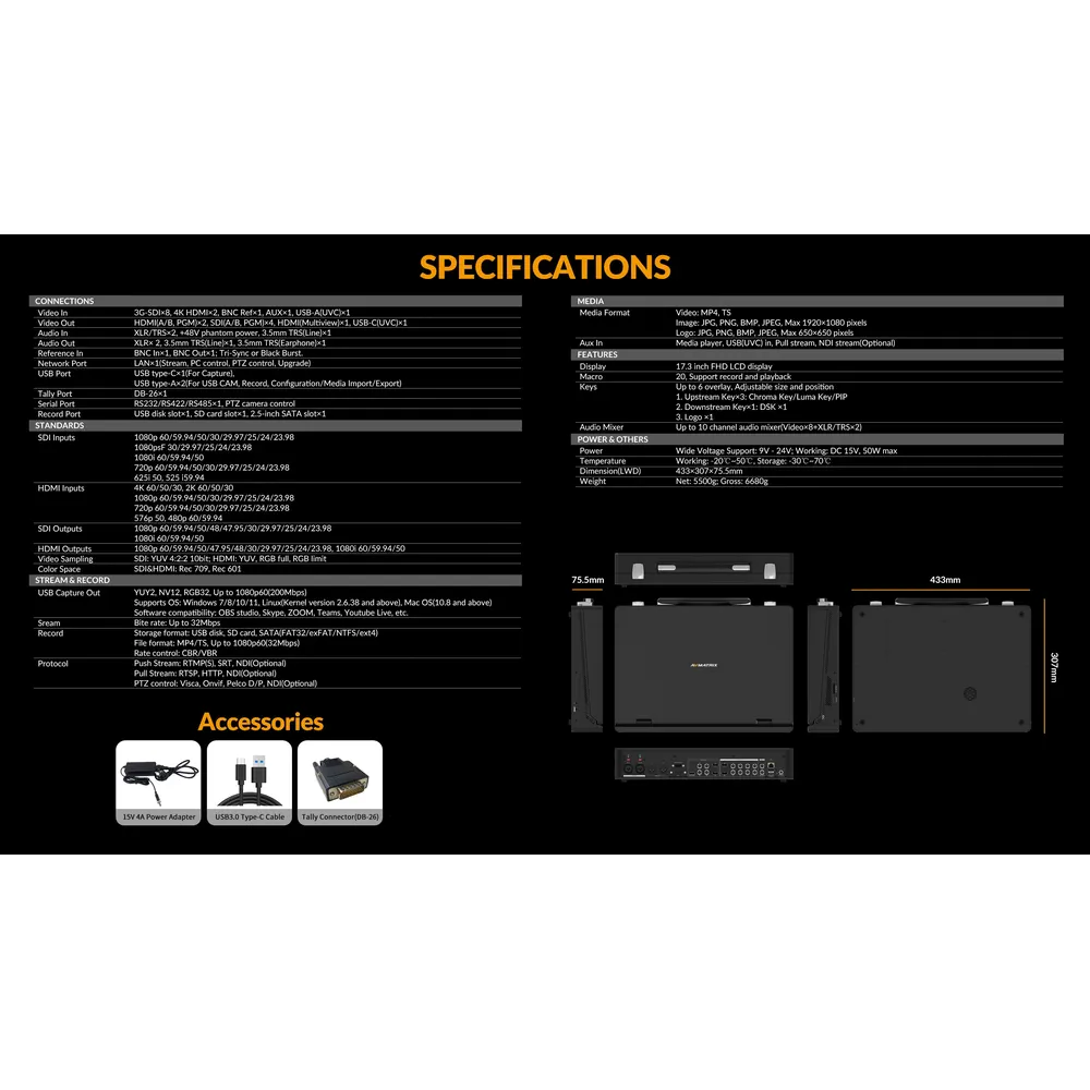 - Outputs: 2×HDMI(A/B) PGM (configurable), 4×SDI(A/B) PGM (configurable), 1×HDMI MV (source configurable), 1×REF output