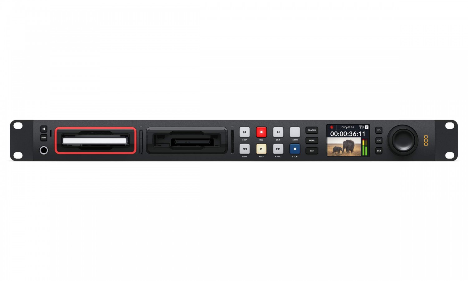 HyperDeck Studio features traditional deck style transport controls, including a search dial for jog, shuttle and scroll. The LCD includes monitoring for video, plus audio level meters, selectable between technically accurate VU or PPM ballistics. The combination of familiar VTR style controls with the built in LCD screen makes HyperDeck Studio incredibly fast to use and very easy to learn.
