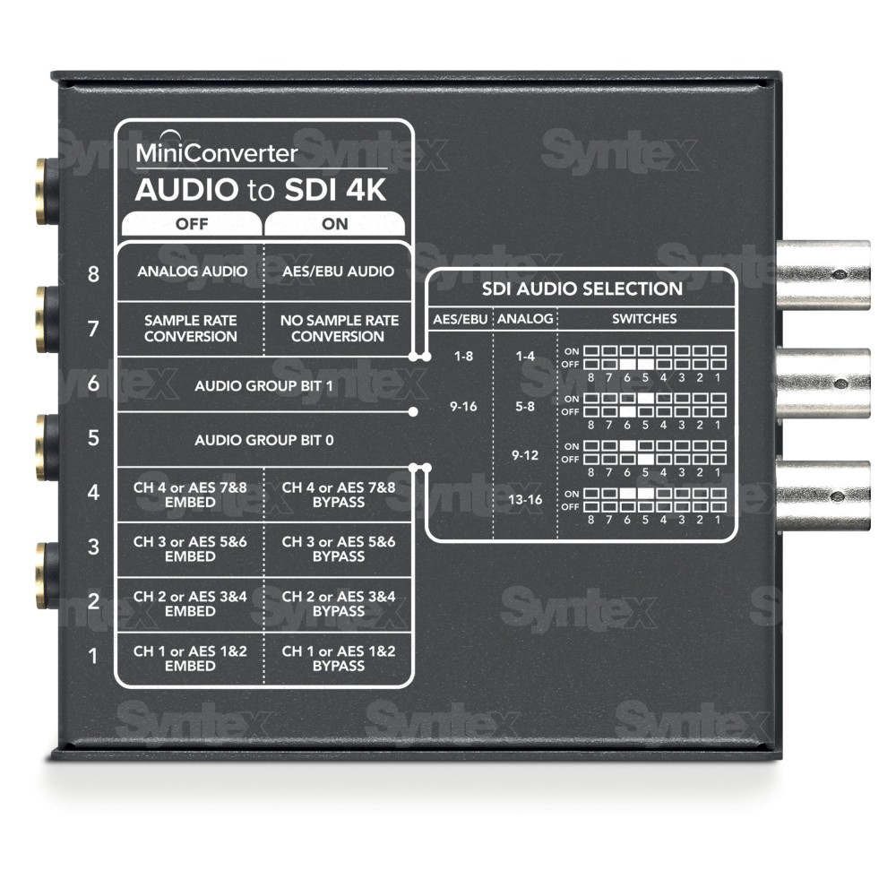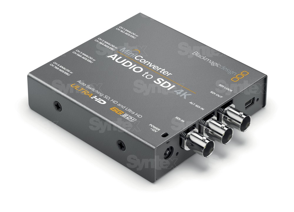 Mini Converter Audio to SDI 4K embeds 4 channels of analog audio or 8 channels of AES/EBU digital audio into any SDI video connection. Customers can embed professional audio from devices such as audio mixers and analog decks into SDI video connections for use with SDI routers and decks or to add extra audio channels to video converters.