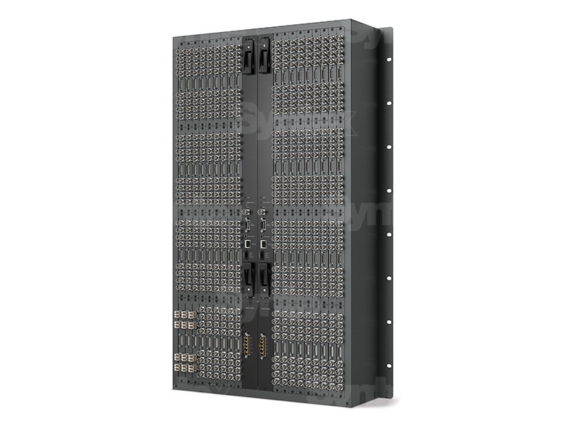 Rack frame lets you add up to 72 BNC SDI or optical fiber SDI interfaces plus a single 72 x 72 or dual 288 x 288 crosspoint cards and up to two power cards. Add a single crosspoint for affordability, or add dual crosspoint and power cards for full redundancy. Includes removable fan tray and fans.