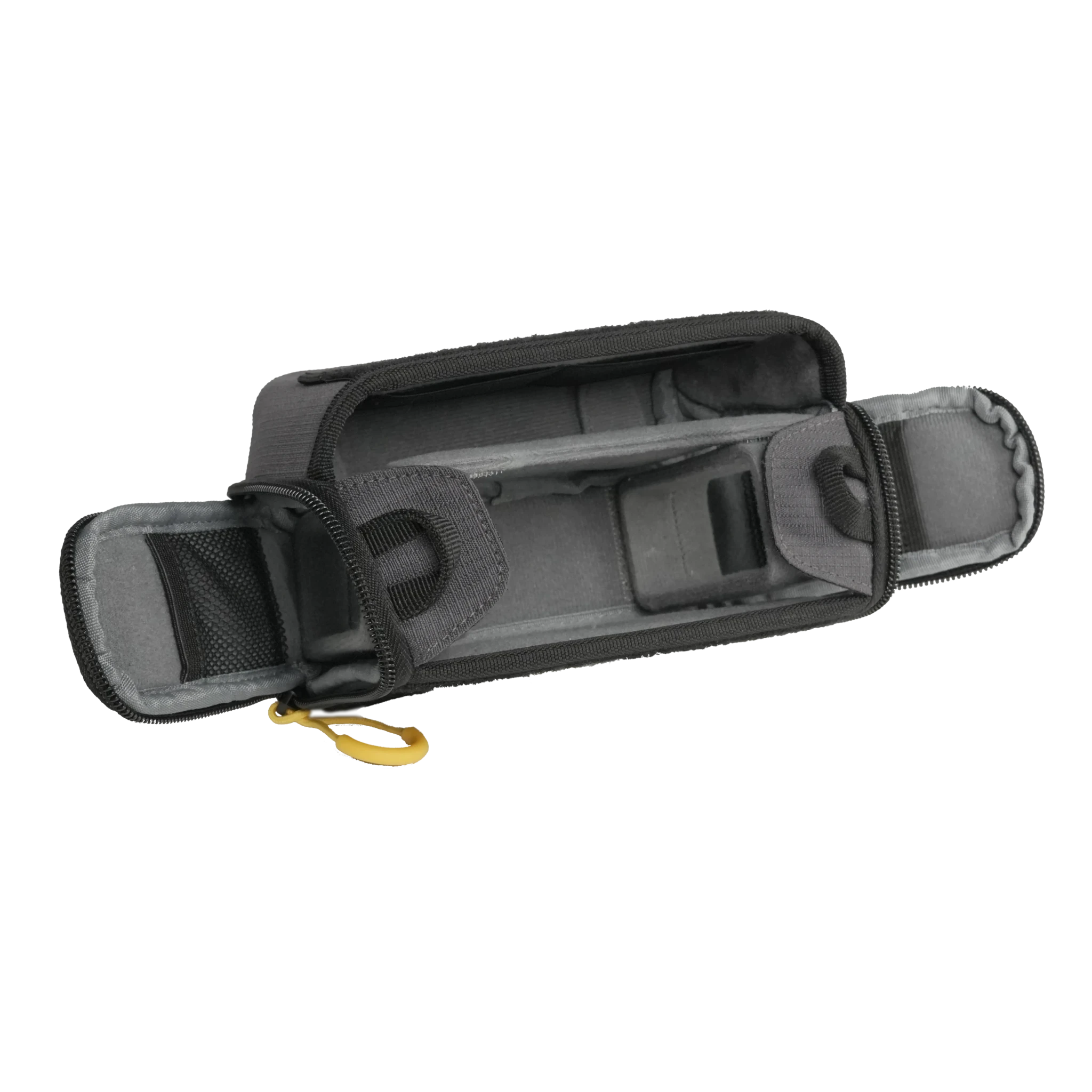Inside the bag, a metal support frame and internal sub-chassis give the bag structure and help separate the recorder from the accessory pouch, keeping gear organized while protecting the recorder during transport and use. The entire interior is lined with soft Velcro-compatible felt, allowing users to customize the interior with hook-and-loop mounted accessories.