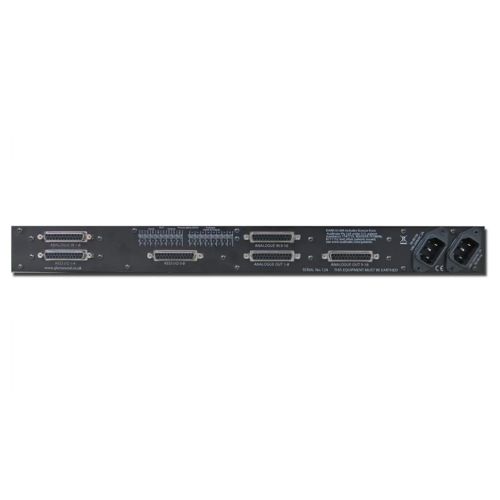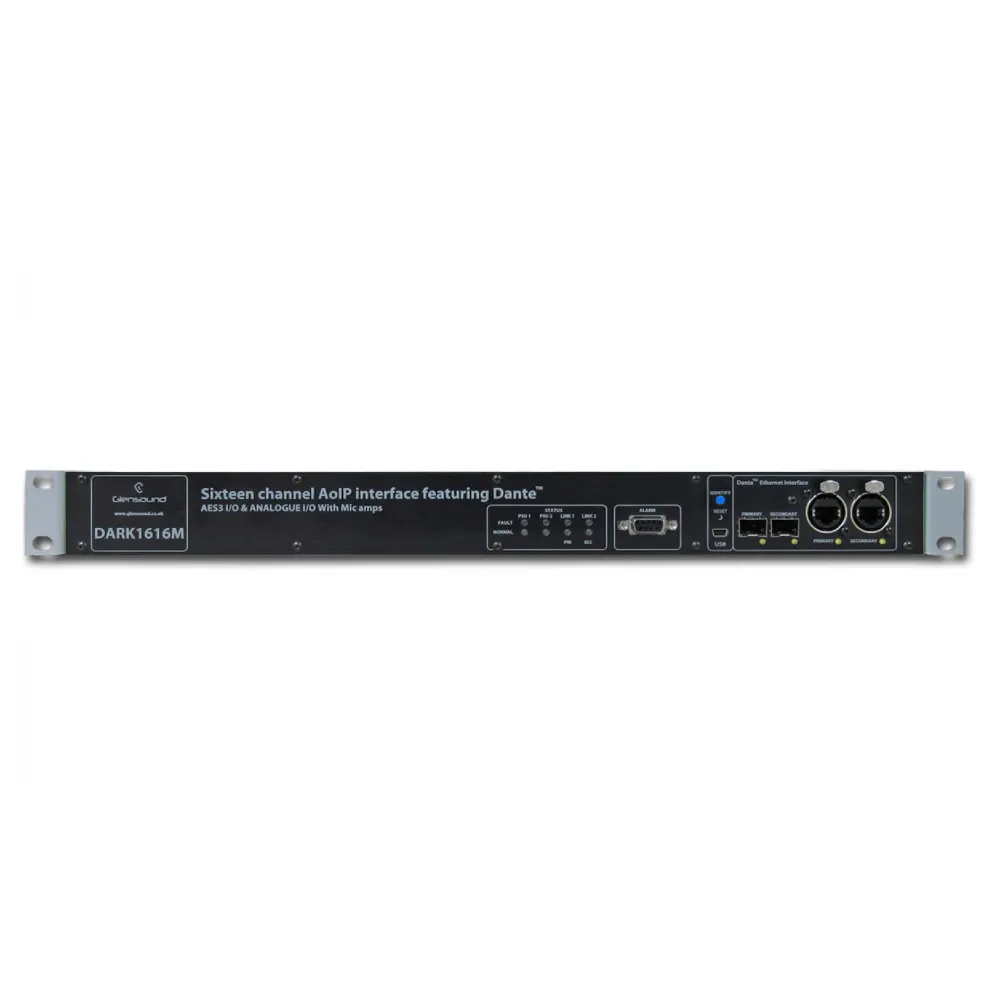 Being designed for resilient broadcast applications the DARK1616M features both redundant power supplies and redundant Dante network links with link status GPOs (general purpose outputs (solid state relays)). Both primary and secondary network links are provided with both magnetic (copper RJ45) and fibre (SFP) interface connections. The Dante system itself provides a completely transparent redundant link system which means that if the DARK1616M lost its primary link circuit the secondary link would automatically take over with no loss of audio.