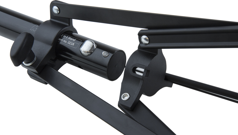 Features a removable central pole which can be easily detached from the base and used as a boom. The Two-in-One Stand features an innovative locking design equipped in the side of the pole and base which allows insertion of the pole into the base and twists to securely lock. The pole is locked firmly until the spring release button on the side of the pole is pressed. The foldable legs also make the closed length of the stand ideal for traveling and storage into a backpack or carrybag.
