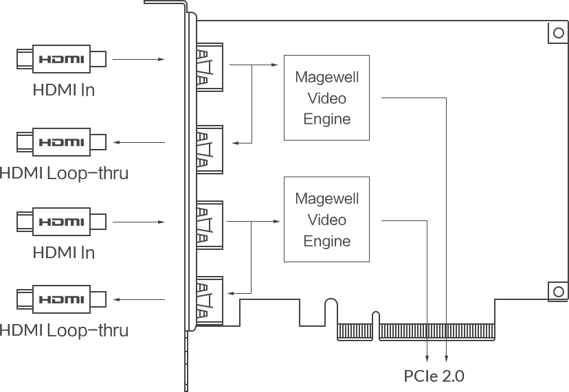 The Magewell Pro Capture Dual HDMI 4K Plus LT, is a High-performance, low-latency PCIe capture card with extra bandwidth features. This Two-channel 4K PCI card captures HDMI signals with embedded audio and supports input resolution up to 4096×2160 pixels. This card also allows you to Loop-through two HDMI + embedded audio signals to an external screen.