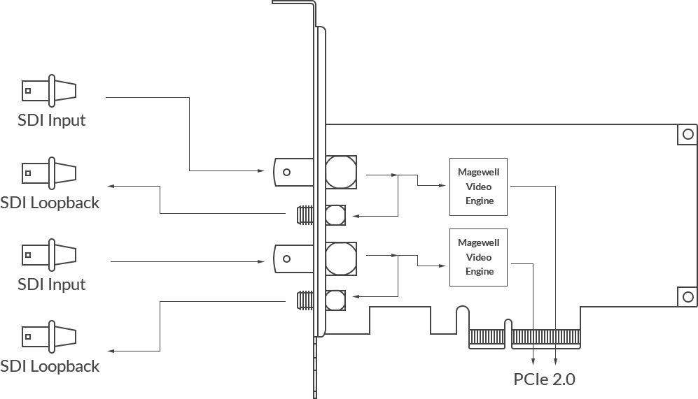 The Magewell Pro Capture Dual SDI is a High-performance, low-latency PCIe capture card. This Two-channel HD PCI card captures SD/HD/3G/2K SDI signals with embedded audio and supports input resolution up to 2048×1080 pixels. This card also allows you to Loop-through two SDI + embedded audio signals to an external screen.