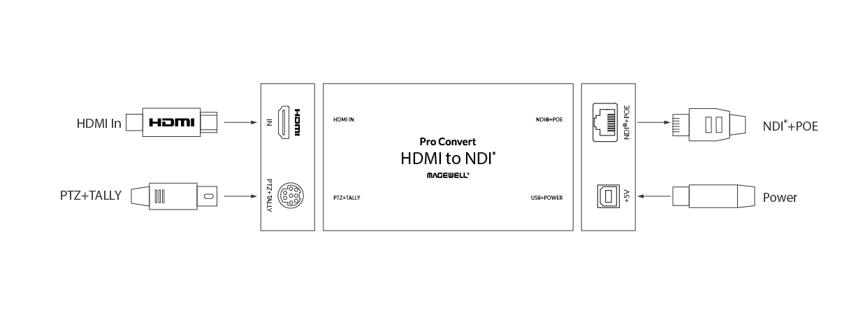The Magewell Pro Convert HDMI TX converts one HD HDMI input signal into Full NDI®, enabling users to connect existing source equipment into NDI or IP media networks. This device supports one HDMI video signal up to 2048×1200 60fps with 8bit NDI encoding up to 2048×1200 60fps.