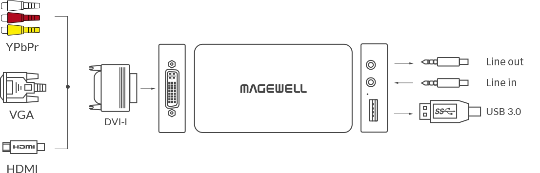 The Magewell USB Capture DVI Plus is a capture box and converts DVI video signals with embedded audio to USB 3.0. Users can bring one of these video signals with resolution up to 2048×2160 to any computer for recording or streaming. The Magewell USB Capture Utility enables users to set their own desired capture-related parameters such as, capture resolution, color space, frame rate (and much more).