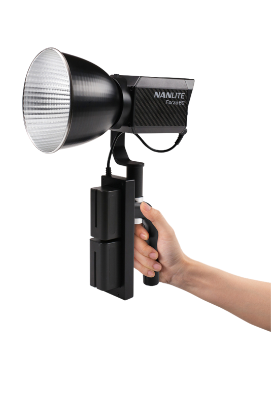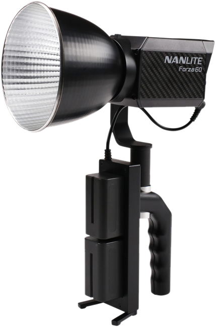 The Nanlite Forza 60 Battery Grip provides an ergonomic handle as well as approx. 1 hour of cord-free runtime at 100% brightness when equipped with 2x Sony L style NP-F750 batteries. It also features a standard 5/8" receiver for direct moutnting on any standard light stand and retractile feet for standalone support.