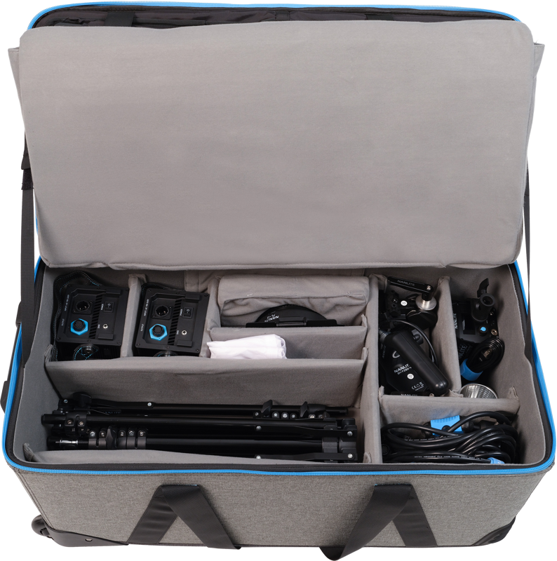 The included rolling case is designed to provide ultimate convenience and protection for your entire lighting kit. With its durable construction and custom compartments, the case safely stores and organizes all components, including the two PavoSlim 120B panels, Forza 60B II, and all accompanying accessories such as softboxes, light stands, and the Fresnel lens. Its spacious interior ensures that everything fits neatly, while the smooth-rolling wheels and sturdy handle make transport effortless, whether you’re moving between rooms or traveling to on-location shoots. This thoughtfully designed case ensures that your equipment stays protected and ready for use, wherever your work takes you.