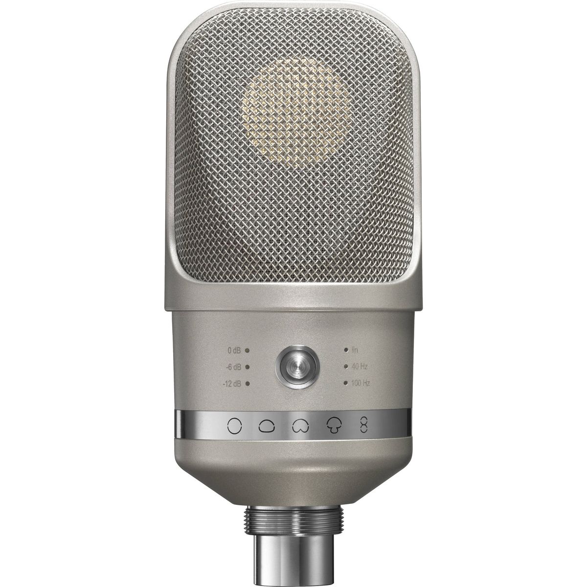 Neumann decided to give the TLM 107 a modern look, although the large tapered headgrille does echo the iconic design of such Neumann classics as the M 49 tube microphone. The stylish navigation toggle on the back of the microphone is a joy to use as it controls all settings in one place: pad (0/–6 /–12 dB), low cut (lin/40 Hz/100 Hz) and polar patterns (omni/wide cardioid/-cardioid/¬hyper¬cardioid/¬figure-8).