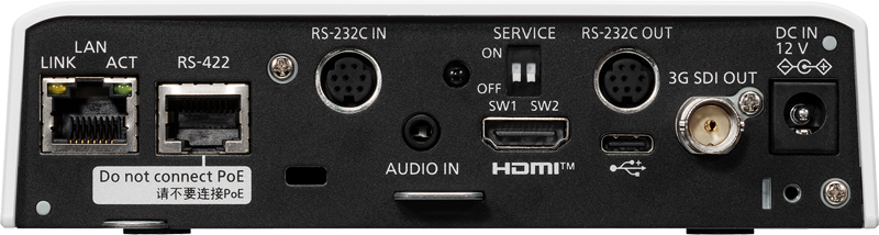 Power and control via PoE+ or 12 V DC; LAN 100/1000BASE-T; RS-422 (RJ-45) and RS-232C (Mini-DIN)