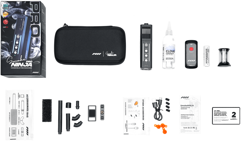 Note: Do NOT use third-party fog liquids with the SmokeNINJA-Pro. The PMI Cloud Formula is designed to optimize the machine’s performance. Due to the unique technology of the chamber, other fog formulas will not work and may cause undesired effects. PMI are not liable for any harm and/or damage when using third-party fog liquids with the SmokeNINJA-Pro.