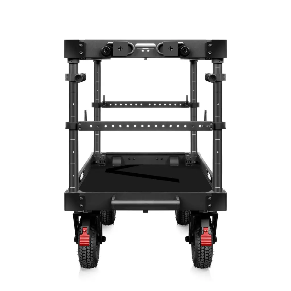 The SHAPE WAGON 40’’ Camera cart. Designed for the convenience of pro filmmakers, videomakers , photographers, camera assistants or any member of a Film/TV crew, its design allows several different applications possible. This travel-friendly cart makes moving around to different locations very easy. Robust construction: Manufactured with CNC precision, and made of steel and aluminum alloy, it ensures durability and is capable of supporting loads exceeding 200 Kg. Equipped with all-terrain sturdy inflatable wheels, it can withstand any kind of uneven surfaces and conditions. Its back wheels include a 360° swivel caster and a high-load foot brake system. The wheels can be attached via an aluminum dovetail adapter with safety pins and a locking mechanism. Expandable interfaces: It offers an abundance of expandable interfaces on all four corner posts to facilitate the connection of extendable light stands and for coherent connection with various external accessories on all sides. The upright posts lock into place with ergonomic levers and will not loosen over time. Glass-filled nylon corners makes this camera cart rigid and stable. Two height adjustable handles at the back will make it very easy to transport and maneuver. Tool-Free Design: The 40’’ WAGON requires no tools for assembly/disassembly, so it can be built or broken down with ease in just a few minutes. It breaks down into a travel case of just 17cm height with a travel handle and built-in transport wheels when in collapsed (folded) mode. A spring-loaded latch system secures the collapsed cart in place. Two side handle cutouts will make your life easier when loading/unloading. The front fence included ¼’’-20 & 3/8’’-16 threaded holes with ARRI standard anti-rotating for accessory attachment. It includes a foldable back fence offering office workspace on set or on location. Two carpeted mats are included to keep your camera equipment scratch-free and noise-free, offering smoother operations. To personalize a Film/TV crew’s cart, an aluminum nameplate is included and can be engraved with the user’s own name. (optional). The WAGON 40’’ camera cart has a 3-year warranty.