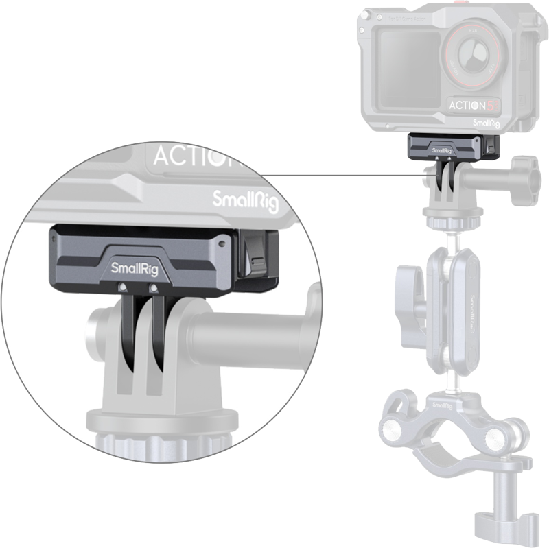 Designed to enhance the versatility of DJI Osmo Action 3 / 4 / 5 Pro cameras. Crafted from aluminum alloy, it features internal magnets, a 1/4″-20 threaded hole at the bottom, and a foldable dual claw interface for attaching action camera accessories.