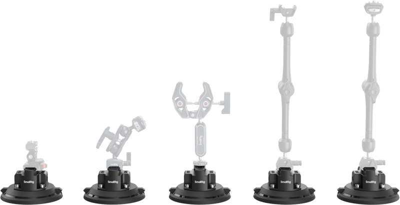 The aluminium-alloy suction cup camera mount comes with such accessory mounting points as 1/4″-20 threaded holes, 3/8”-16 threaded holes and ARRI 3/8″-16 locating holes for attaching SmallRig: 3757, 3873, 3874, 3875, 2906 etc.