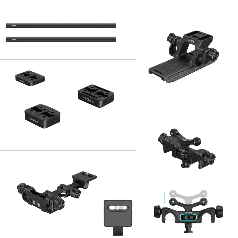 The camera body is connected to the dual rod system through a hinge, offering flexible and adjustable compatibility with various camera models.