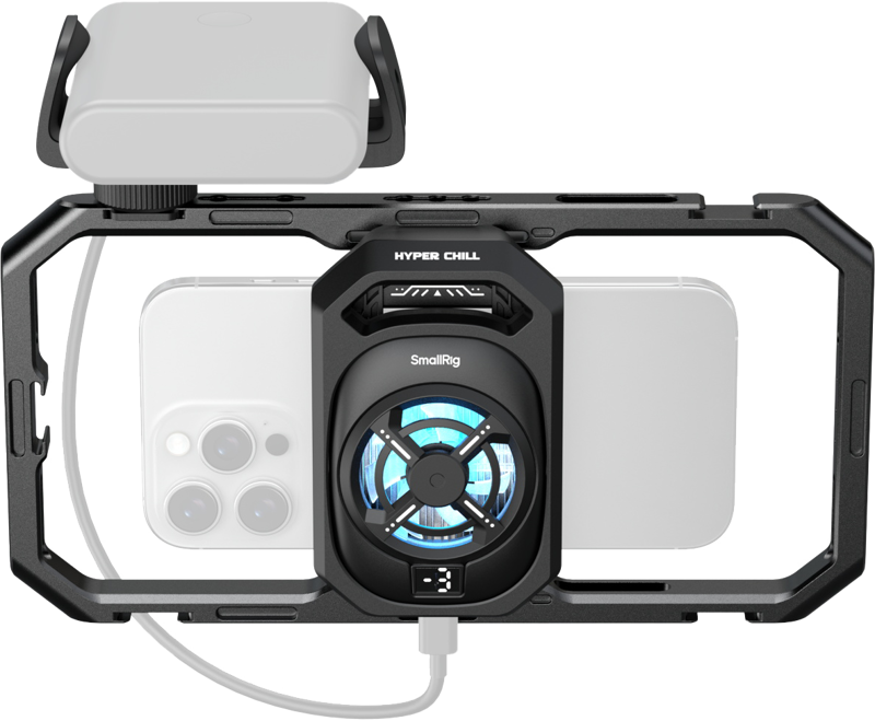 The phone cage features a powerful 15W cooling system with three cooling levels, effectively preventing device overheating and eliminating issues such as screen blackouts and unexpected shutdowns during extended shoots.